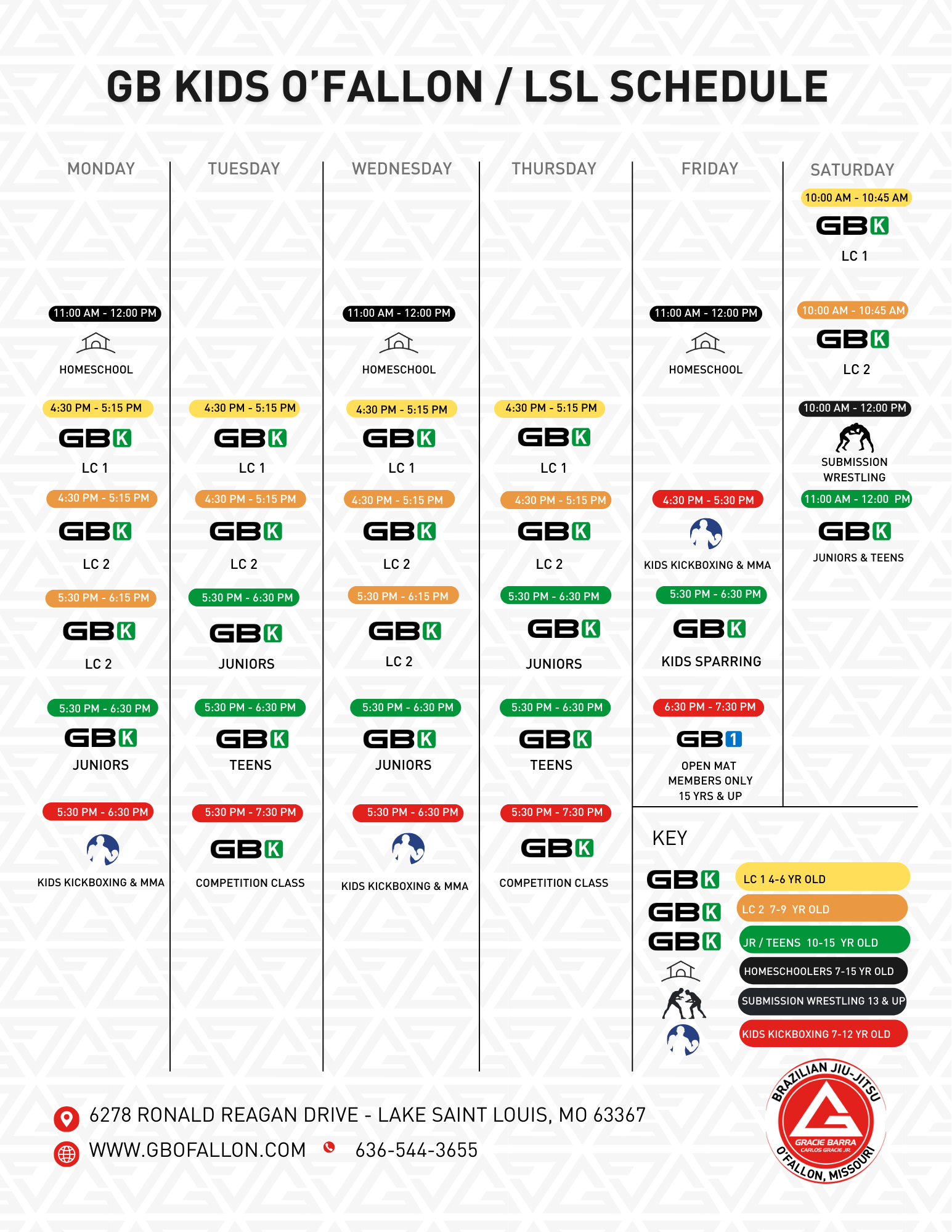Class Schedule: Explore our martial arts class schedule for both O’Fallon and Chesterfield. We offer Jiu-Jitsu, kickboxing, and self-defense classes for kids, teens, and adults—Monday through Saturday. Classes are available at various times throughout the day to fit your routine. Whether you’re just starting or looking to advance your skills, find your perfect fit and start training with us today!